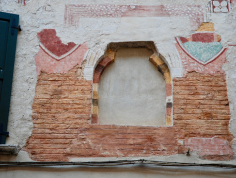 De voorgevel van de dom is helaas slachtoffer geworden van een ingreep in de 19e eeuw. Ooit was die gevel versierd met fresco’s. Het portaal dateert echter nog uit het begin van de 16 eeuw. Een raadsel is dan weer, wat die vier grote, tegen de gevel geplakte zuilen daar doen. Ik kon er niets over vinden.