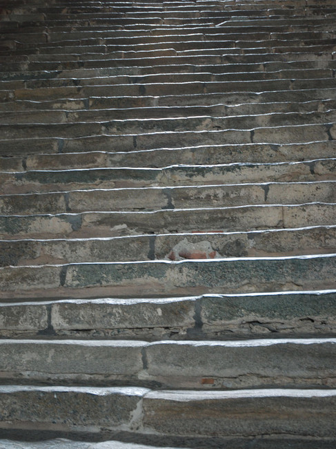 Het torenhoge portaal dat bij binnenkomst boven je oprijst doet je meteen ineenkrimpen. Voor je ligt, bijna als een ladder zo steil, de scalone dei morti met zijn door de eeuwen heen uitgesleten treden. Als je goed luistert, hoor je er de monniken sloffen op hun eindeloze rituele ommegangen door het klooster. De trap ontleent zijn naam aan het gegeven, dat er vroeger graven aan de zijkant lagen.