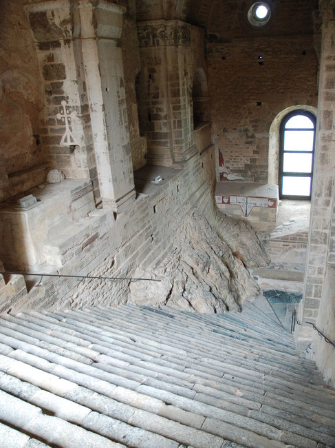 Via de porta dello zodiaco, omzoomd door schitterende romaanse zuilen en kapitelen die met de tekenen van de dierenriem verwijzen naar de vergankelijkheid van het menselijk leven, komt de ādodentrapā uit op een buitenbordes met een bizar geheel van steunbogen. Van hieruit loopt weer een trap naar de abdijkerk, gebouwd boven een crypte die de kiem vormt van het steeds verder uitgebouwde complex.